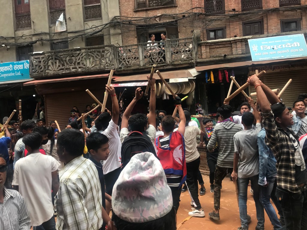 What is more unique about Gai Jatra in Bhaktapur is the Ghinta Ghisi dance which shows similarities to the Morris dance, a form of English folk dance. The dance is performed in a long row of people, performing rhytmic stepping and choreographed figures, the two opposite people hitting each other’s stick.