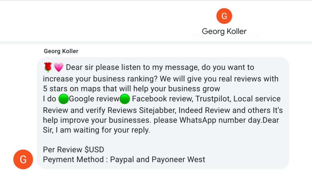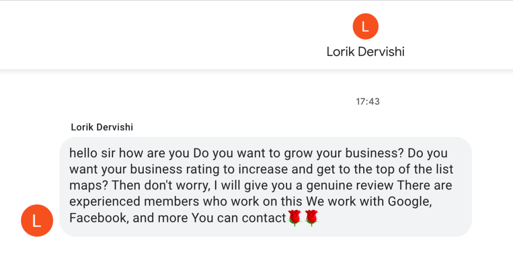 Day one, I get this message (grey) from a ‘verified level 4 5 local guide’. I respond immediately (blue), not even suspecting that this was just the beginning of a series of deceitful encounters that would happen on a daily basis.