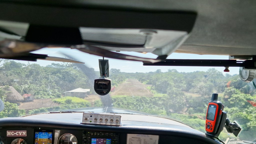 After a good hour in the air, the plane dips, and you see it: a narrow, reddish-brown field strip carved into the forest, the kind of colour of a tennis court.