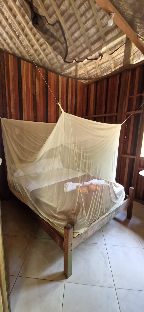 Your cabin has wooden walls but has an open ceiling. Your bed is covered in mosquito netting. Even the ceiling has netting, and the floor tiles are far away from the authentic living conditions of our hosts – a kind of jungle luxury reserved for visitors only. You take it as a small concession to the nervous system of someone who isn’t used to sharing space with what crawls and flutters.
