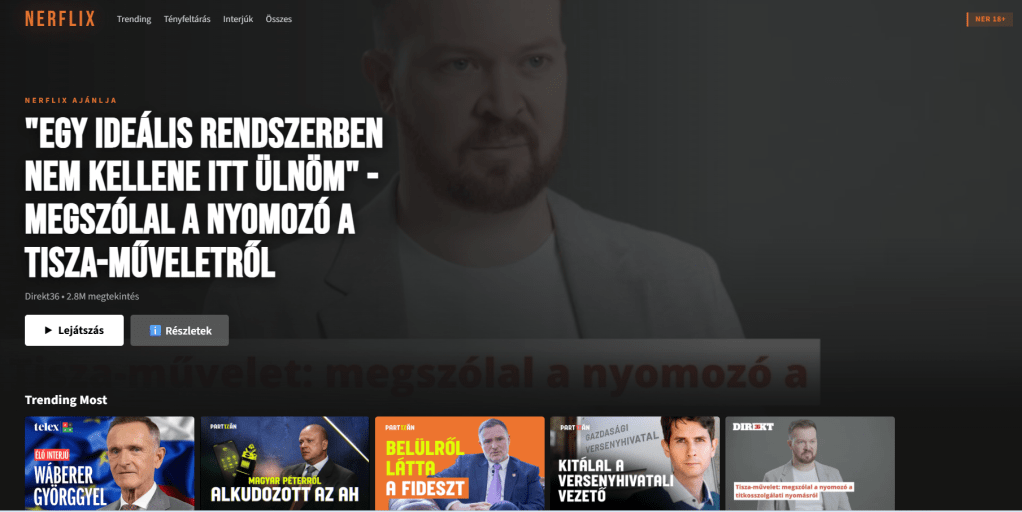 NERflix plays on Netflix, but replaces it with NER, short for Nemzeti Együttműködés Rendszere (“System of National Cooperation”), the official name of the Orbán-era political system that favoured cronies.